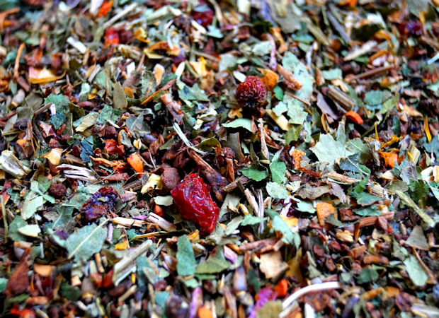 Getrocknete Kräutermischung, bestehend aus: getrocknete Apfelstreifen, Hagebutten, Mariendistelfrüchte,